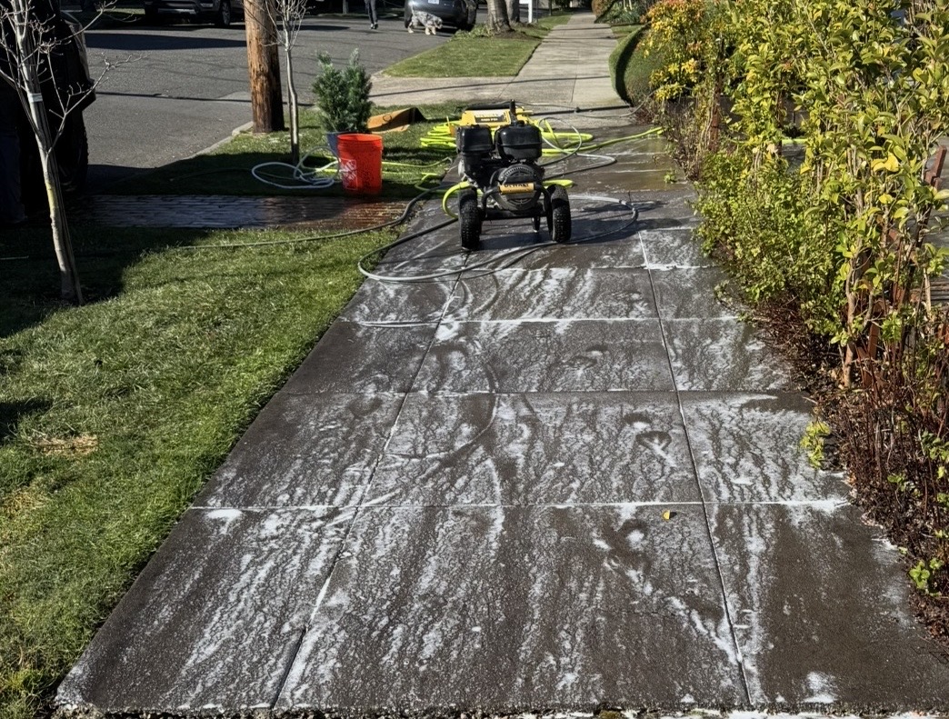 After pressure washing, we apply a professional sodium hypochlorite (SH) post-treatment designed to kill algae, mold, and organic growth deep inside the concrete pores.